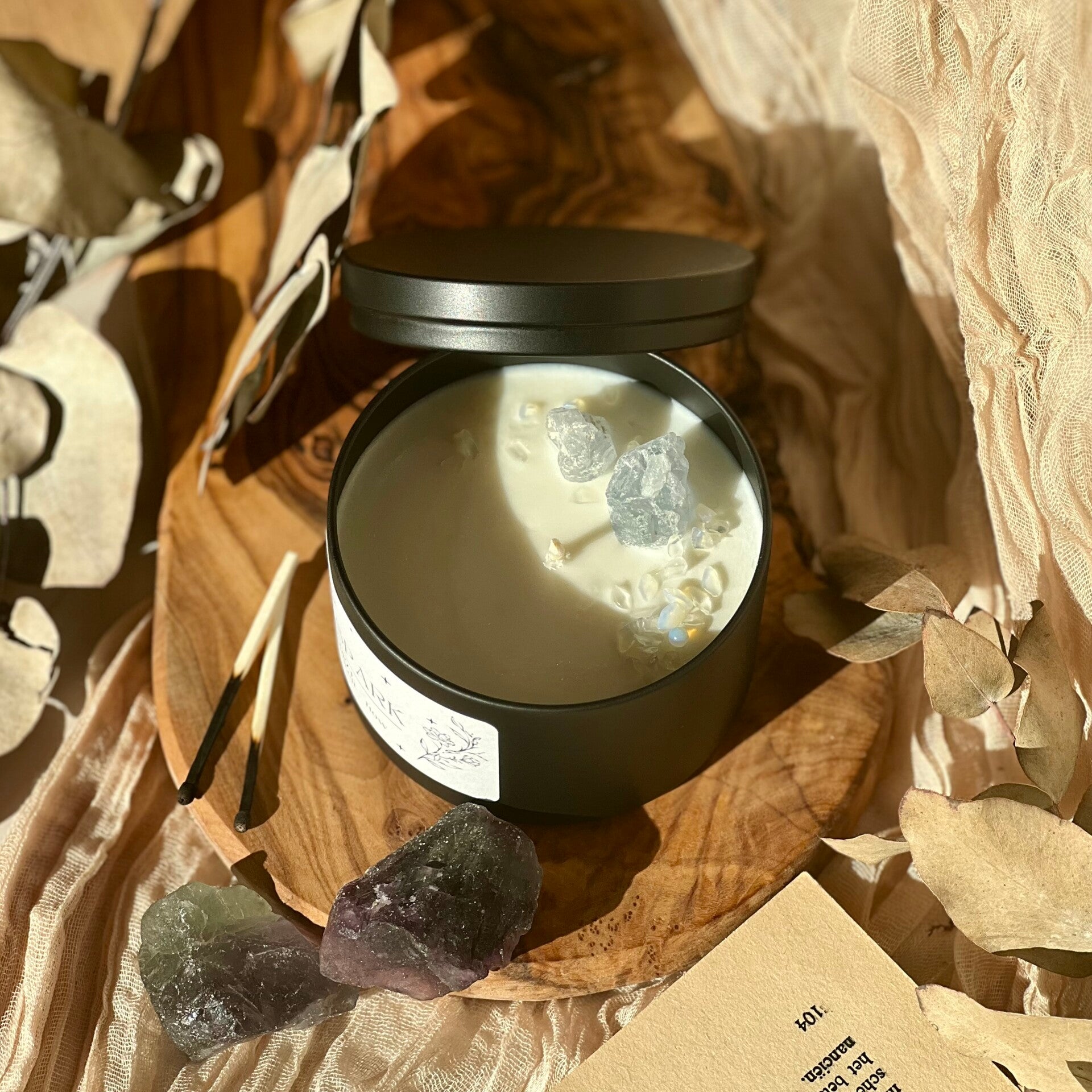 Clarity Spark brengt de verhelderende energie van fluoriet samen met de speelse lichtheid van opaal. Deze kaars helpt je mentale ruis los te laten, je creativiteit te laten stromen en helder te focussen op wat écht telt — ideaal bij een nieuw begin of brainstormmoment.